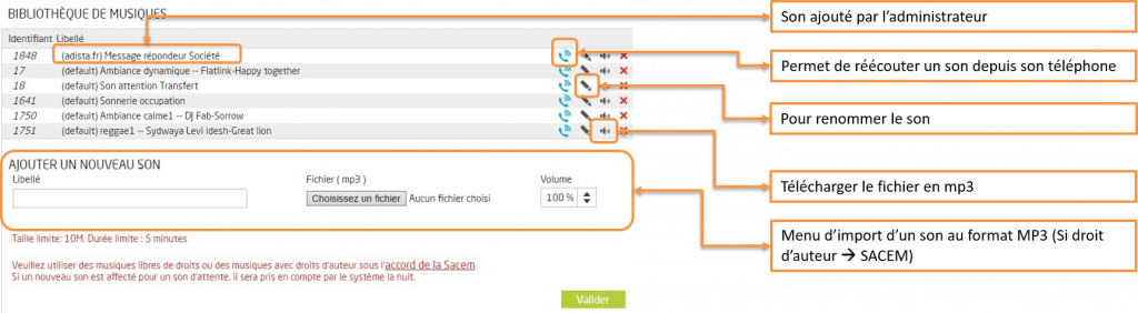 Pour la partie File d’Attente (musique d’attente/prédécroché/messagerie du standard) :