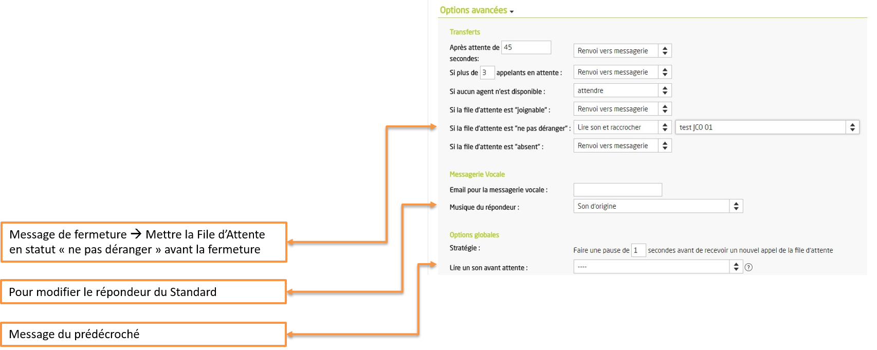 - Ajouter un prédécroché, un message d’absence ou une messagerie à son Standard : Admin à Options à Files d’attentes