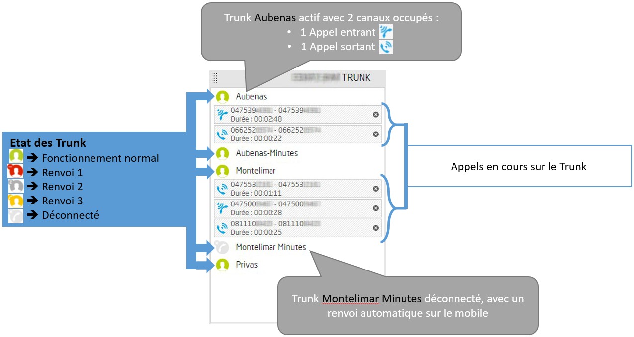Dans cette exemple, il y a 5 Trunks SIP dont 1 qui est déconnecté (Montélimar Minutes), avec en dessous de chacun, les appels en cours.