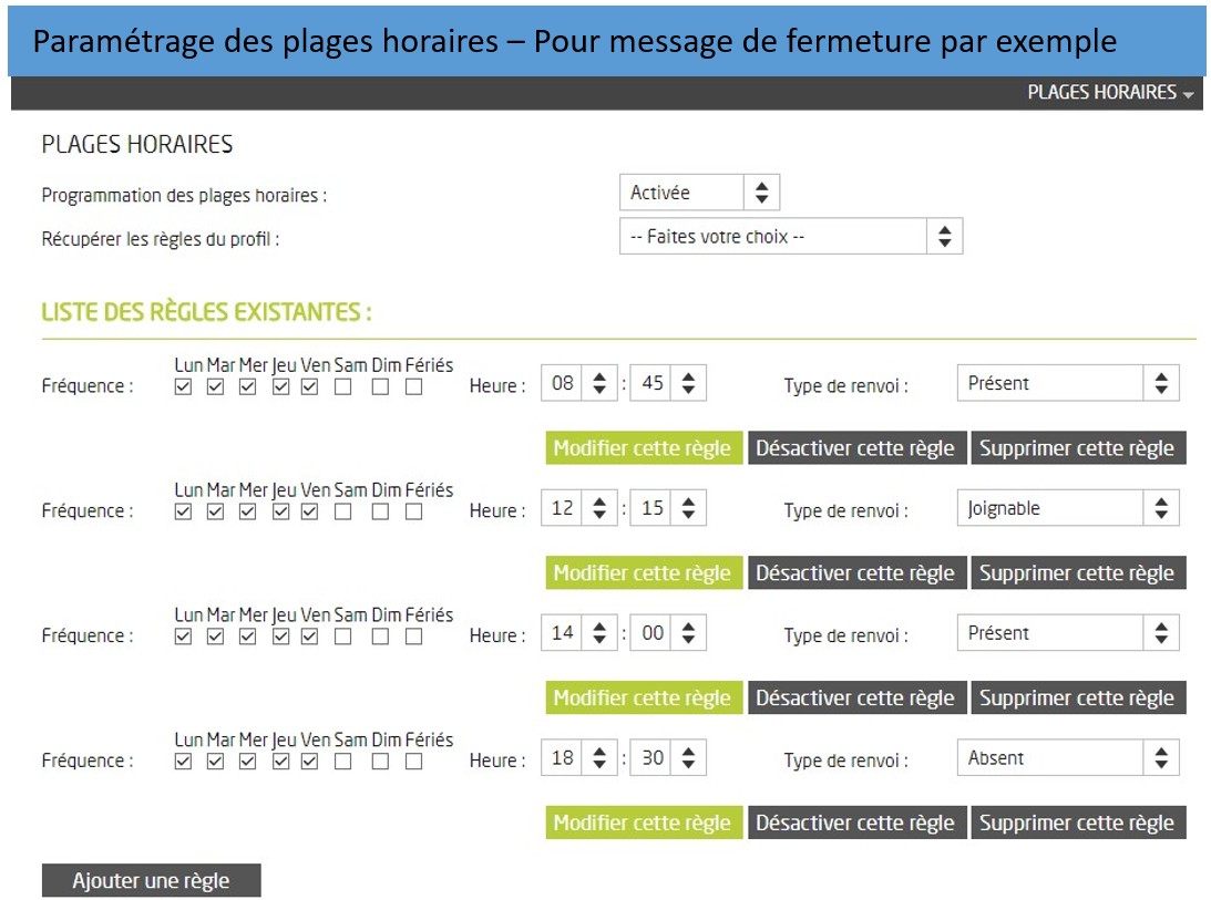 - Administration des plages horaires (exemple : Renvoi vers le message de fermeture en Heures Non Ouvrées) –> Voir plus bas