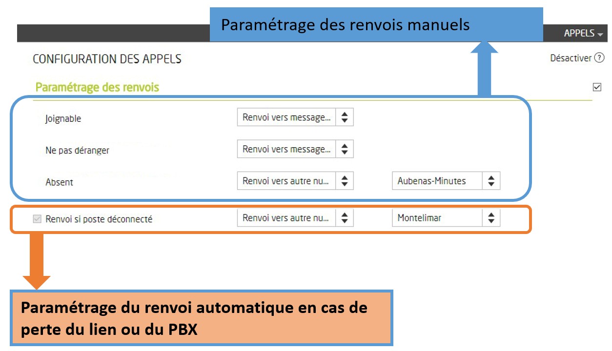 - Déconnecté (Grisé avec croix) : Un basculement automatique est alors activé (Renvoi vers un mobile par exemple)