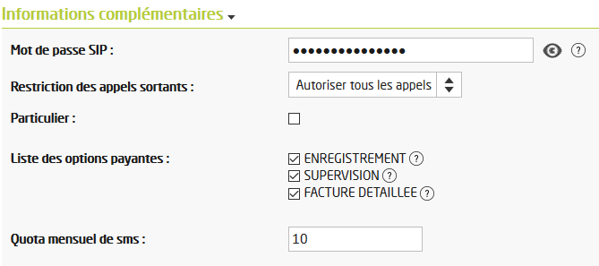 Pour autoriser un utilisateur à envoyer des SMS, il faut renseigner un quota d’utilisation mensuel (glissant) sur cet utilisateur :