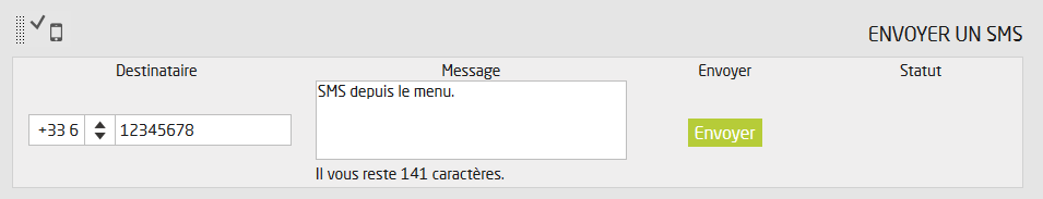Si vous avez utilisé l’annuaire, le champ « Destinataire » est automatiquement remplit sinon il faut le remplir manuellement. Le champ « Message » est limité à 160 caractères (les caractères ‘<‘, ‘>’, ‘€’ et ‘&’ ne seront pas envoyés).