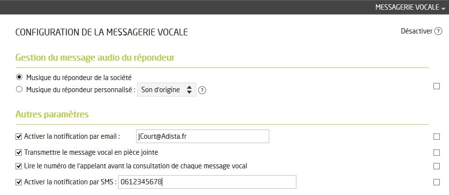 Mon compte -> Mes préférences -> Messagerie Vocale :