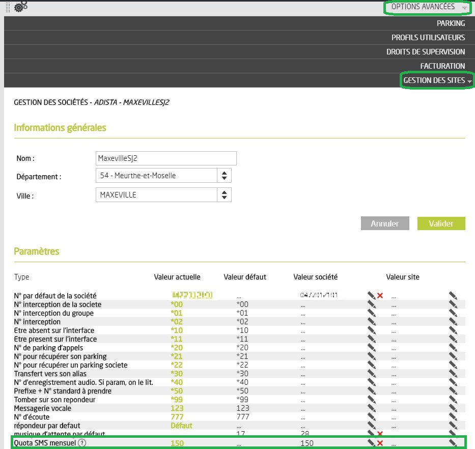 L’administrateur doit activer un quota mensuel (glissant) au niveau de la société ou du site. Ce quota sera global à toute l’entreprise ou uniquement pour un site en particulier :